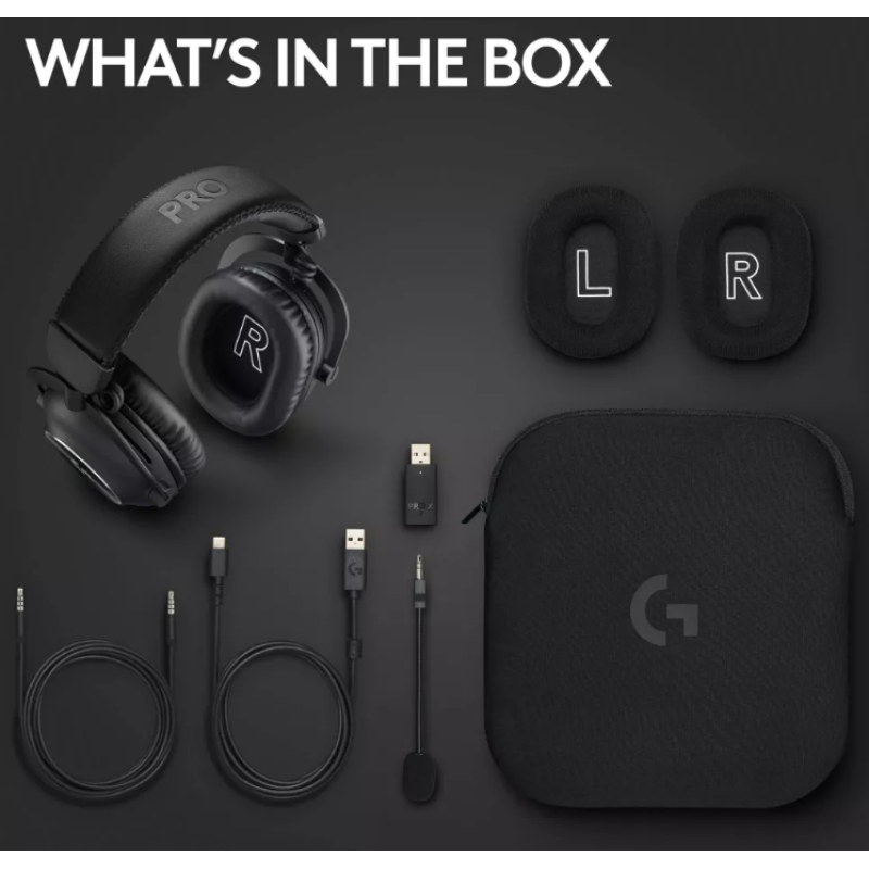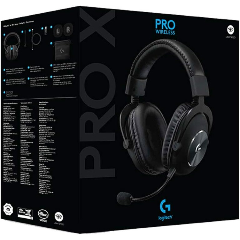 Logitech G PRO X Wireless DTS Headphone:X 2.0 Gaming Headset for Windows with Blue VO!CE and LIGHTSPEED Wireless, Memory foam leatherette ear pads, Extra memory foam cloth ear pads, USB LIGHTSPEED Wireless adapter, Detachable mic with foam wind screen, 6.56' USB A to USB C charging cable, Carrying bag, Owner's manual